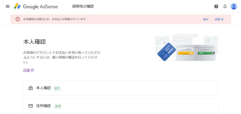 アドセンスのページを一度閉じてもう一度ログインしたら「住所確認が必要なため、お支払いが保留されています」の通知は消えていました。