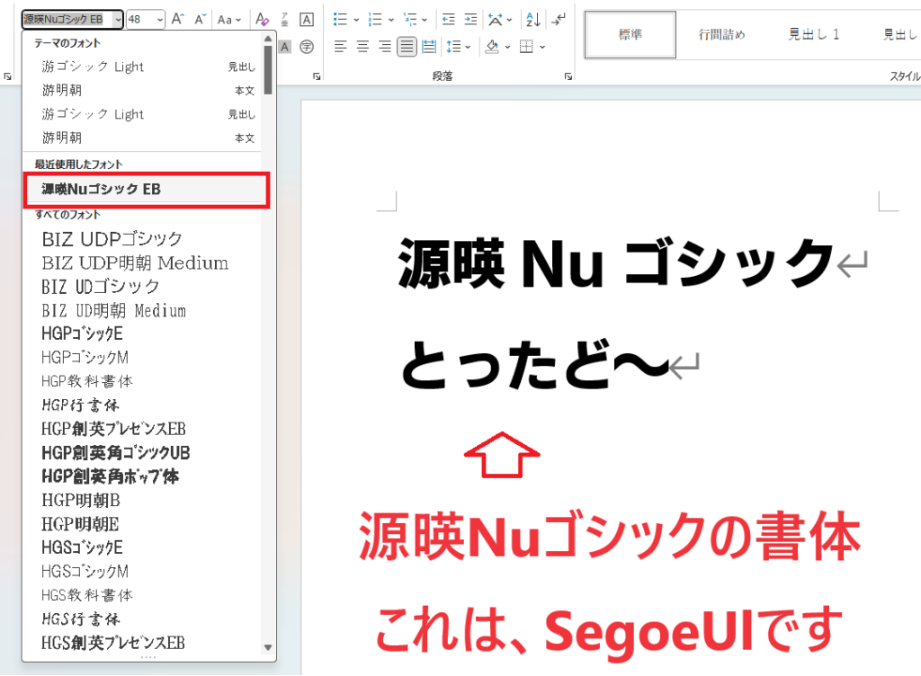 - フォント一覧で 「源暎 Nu ゴシック」 を確認