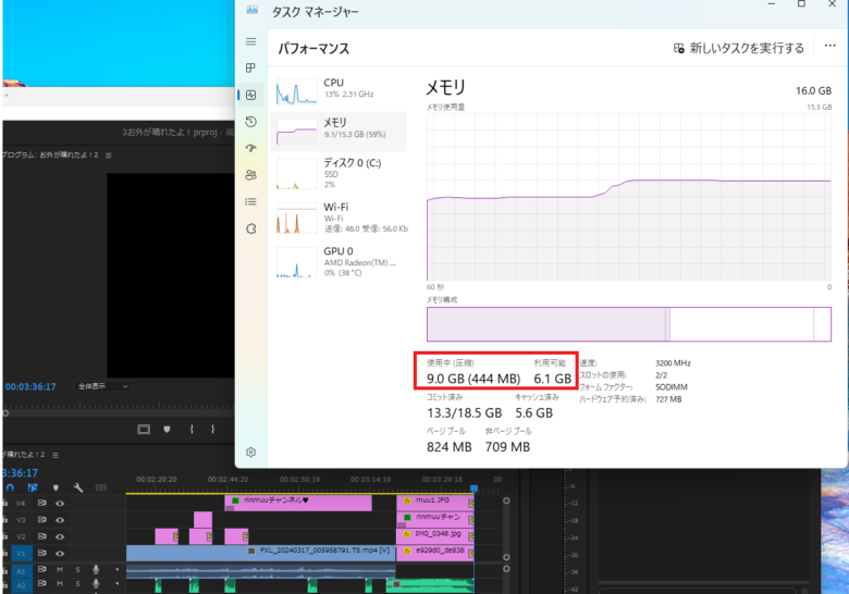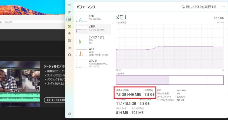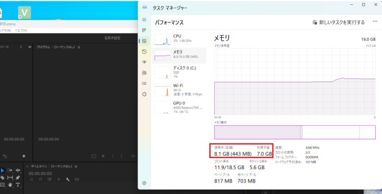 でもきっとこのメモリ常に動いているのでプレミアプロを立ち上げると急激に減るのかな?