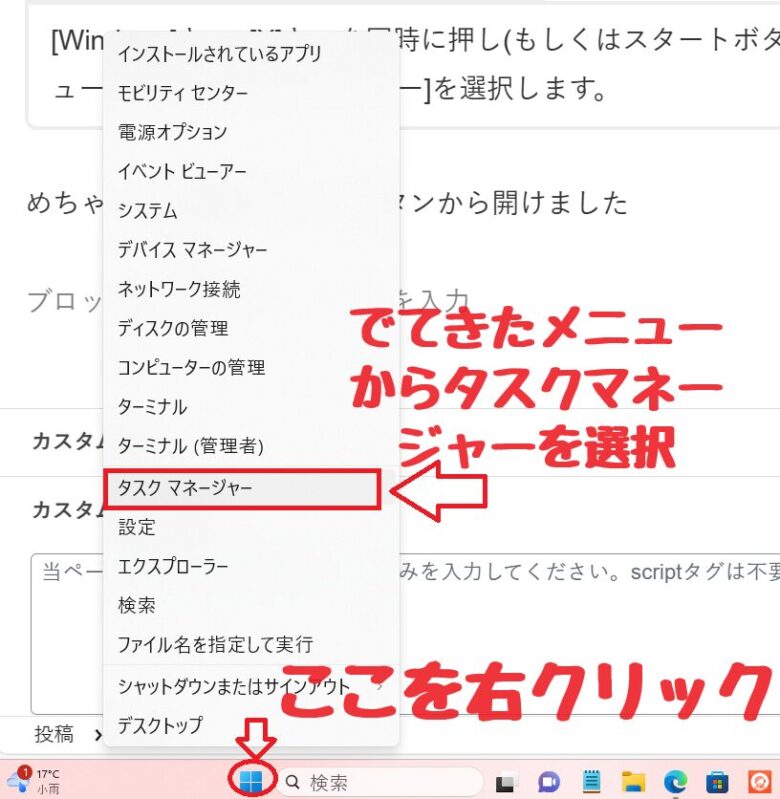 [Windows]キー+[X]キーを同時に押し(もしくはスタートボタンを右クリック)、表示されたメニューから[タスク マネージャー]を選択します。
