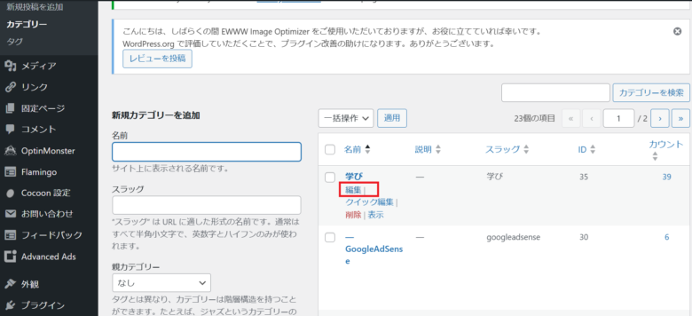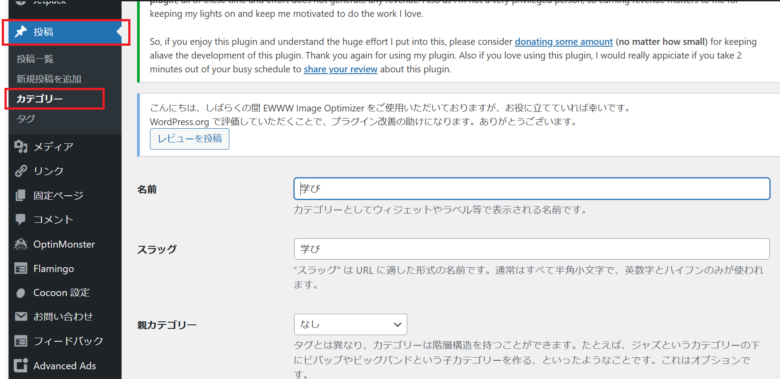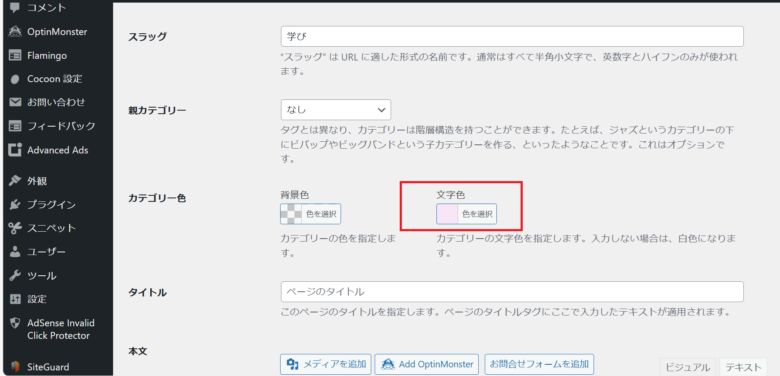 ここまでで、ブログの見た目は変更されています。例えばブログのサムネイルのカテゴリーの背景色がグレーになりますので、文字色など似たような色にしていた場合文字が見えませんのでここでわかりやすい白っぽい色に変更することをおすすめします。変更の仕方は、ダッシュボードの投稿のカテゴリーの中のカテゴリー色の背景色は変更出来ないので、文字色の色を直接クリックすると好きな色を選べます。選択したら、下の変更をまとめて保存をクリックしてください。すべてのカテゴリーで変更します。
