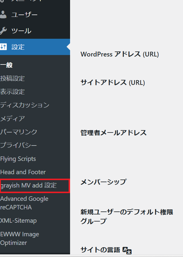 プラグインを有効化すると、WordPress管理画面>設定に、「grayish MV add 設定」という項目が表示されます。