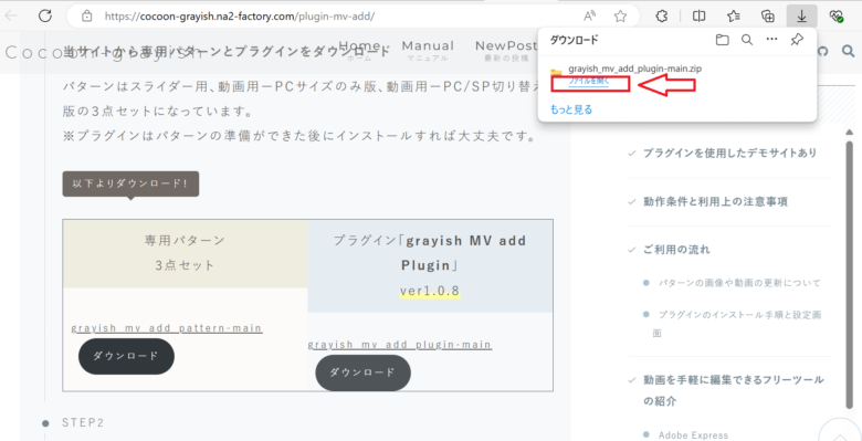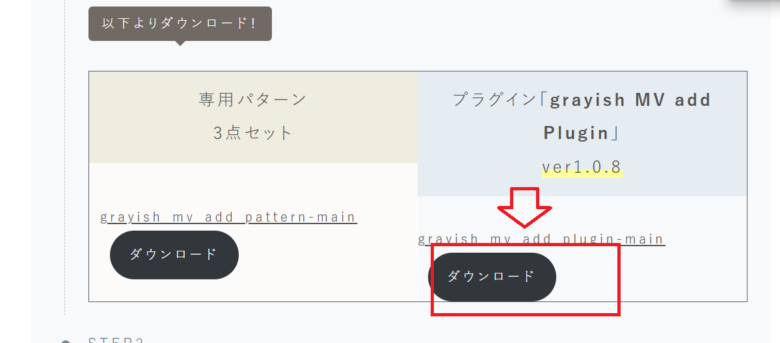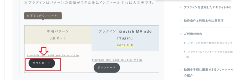 ちゃんと読むとわかるのですが、プラグインのインストールは、普通にダッシュボードのプラグインから新規プラグインを追加で検索してもプラグイン「grayish MV add Plugin」は出てきません。順番にやっていきます。まずは、ダッシュボードのプラグインではなくこちらのページのダウンロードより専用パターン