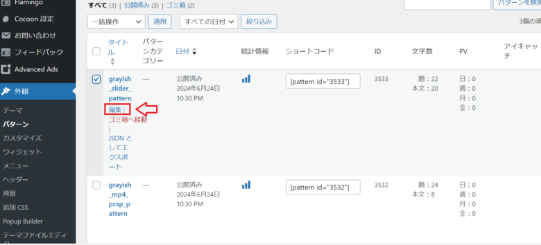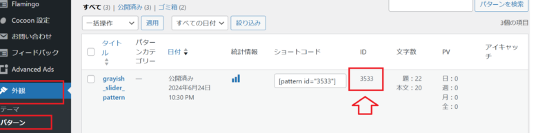 更新したパターンのIDを確認します。ここで今回使用するパターンのIDの数字をコピーしておきます。