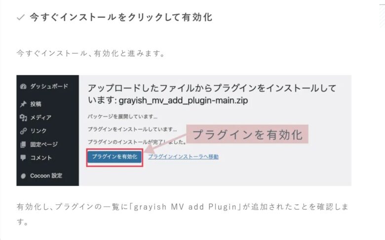 「grayish_my_add_plugin-main.zip」を選択して「今すぐインストール」します。