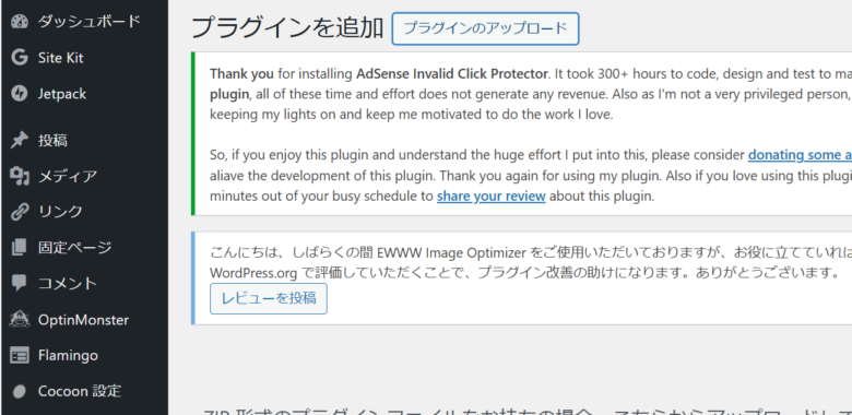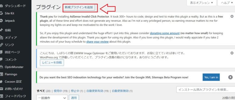 プラグインをダウンロードしたら、ダッシュボードのプラグインを開きます「新規プラグインを追加」をクリックします