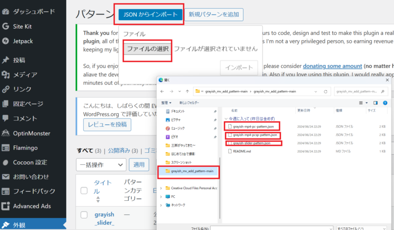 上のJSONからインポートをクリックします→ファイルの選択をクリック→ディスクトップなどファイルの選択をする項目に「grayish_my_add_pattenーmain」という項目が出来ているのでそこを選択すると先ほどダウンロードして開いたファイルが出てくるので一つずつ選択してインポートします。その時点では下のパターンには項目が出ませんでしたが一度戻ってもう一度パターンに入ると3個項目ができていました。