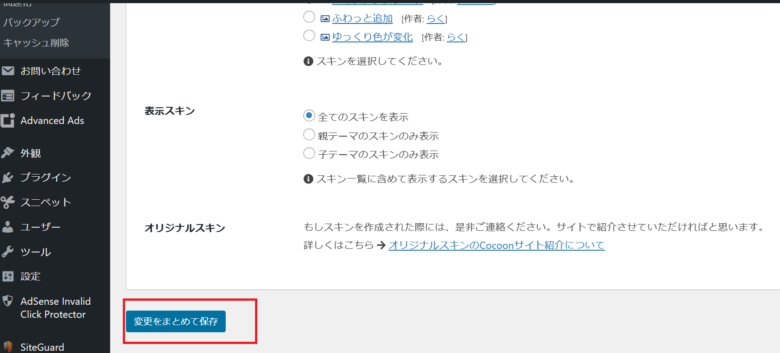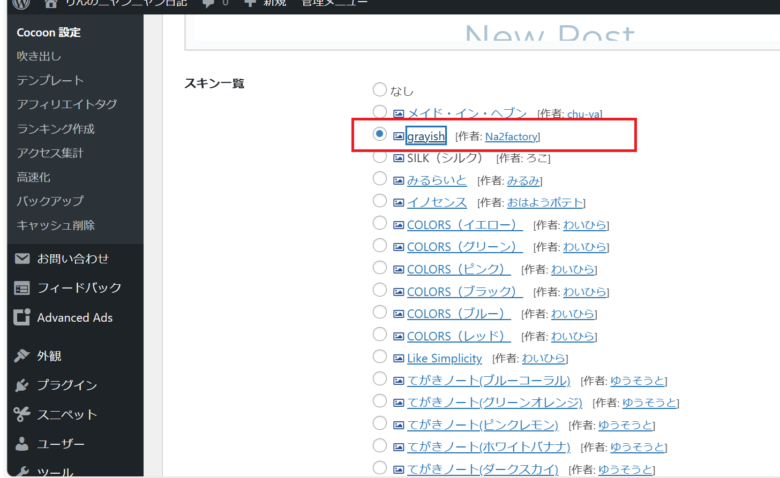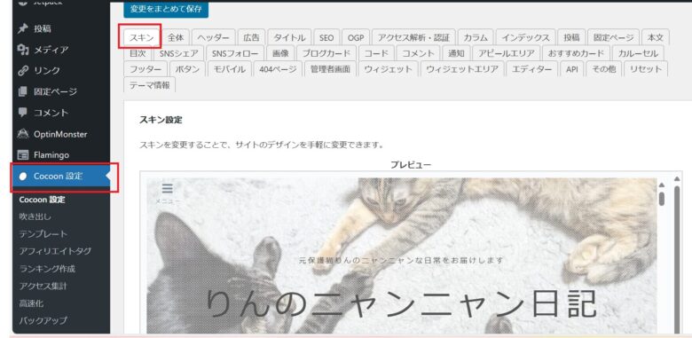まずは、ダッシュボードのcocoon設定からスキンタブのなかのgrayish(グレイッシュ)を選択して、変更をまとめて保存します。