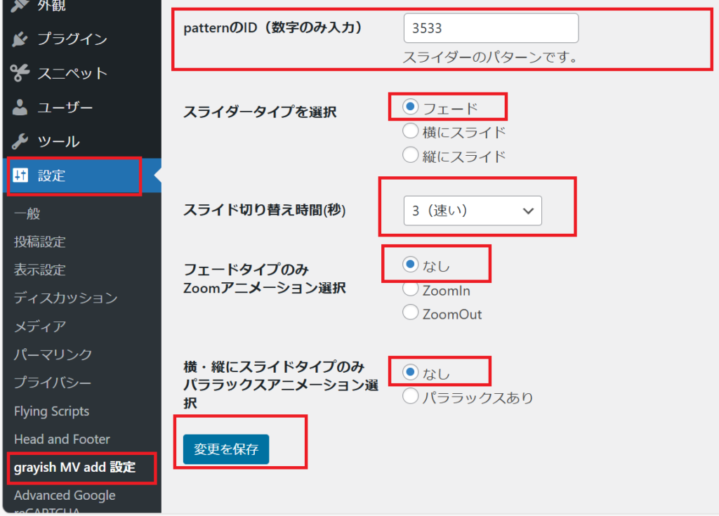 WordPress管理画面>設定に、「grayish MV add 設定」patternのIDには先ほどコピーしておいたIDが入ります