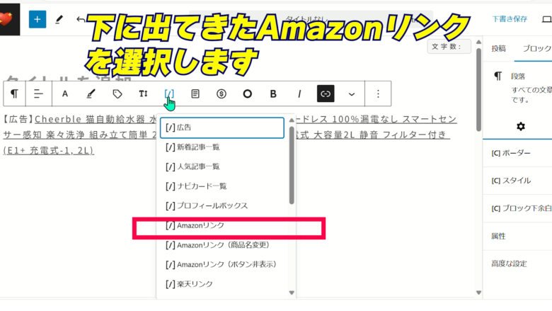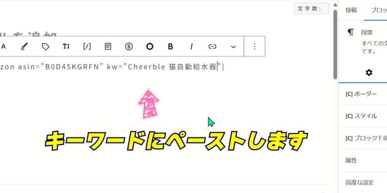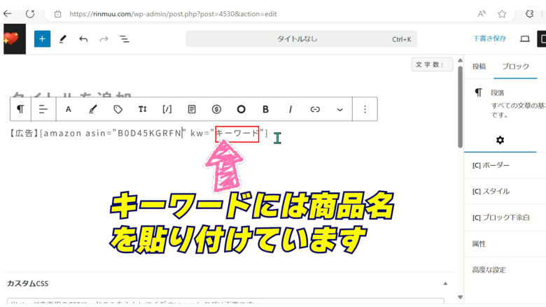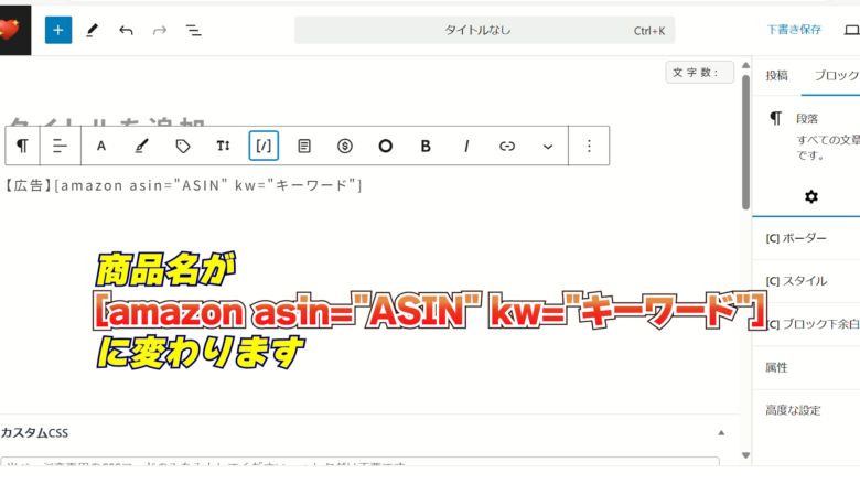 3、商品名が[amazon asin=”ASIN”kw=”キーワード”]に変わります