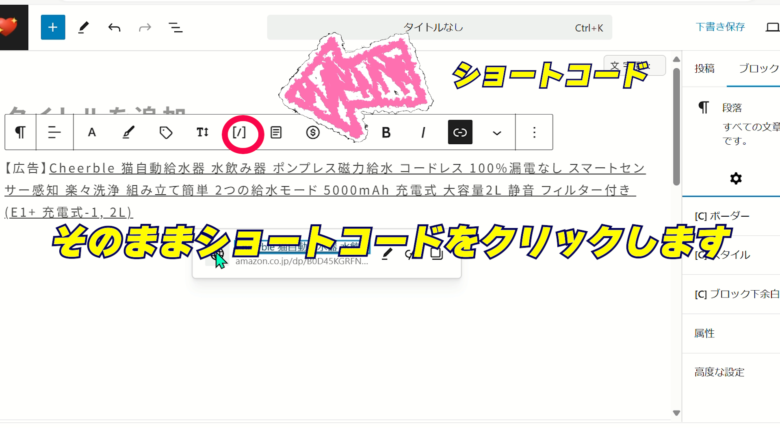 WordPressやCocoonで使う特別なコードで、貼るだけでテキストリンクやASINコードから自動的に画像付き広告を表示してくれる便利な仕組みです。 初心者でも難しい設定をせずに広告を表示できるので、とても便利です。