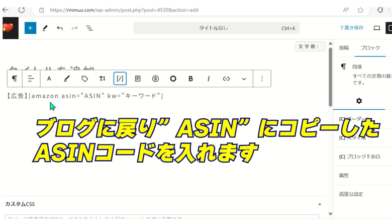 5、ショートコードの ASIN欄に貼る