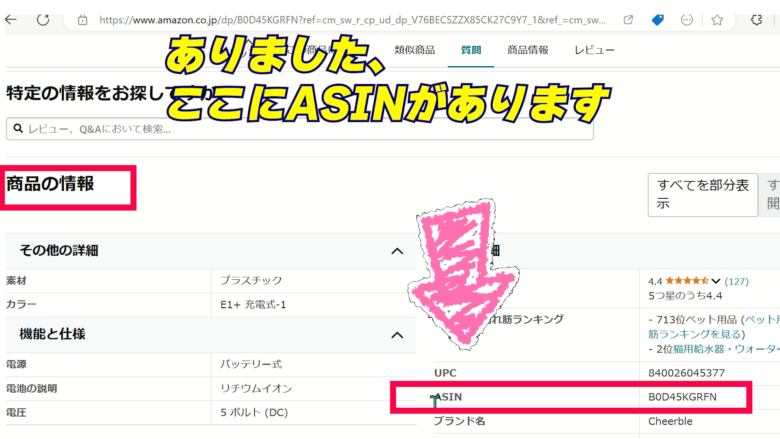 ASINは、Amazonの商品ページを下までスクロールすると表示されています。