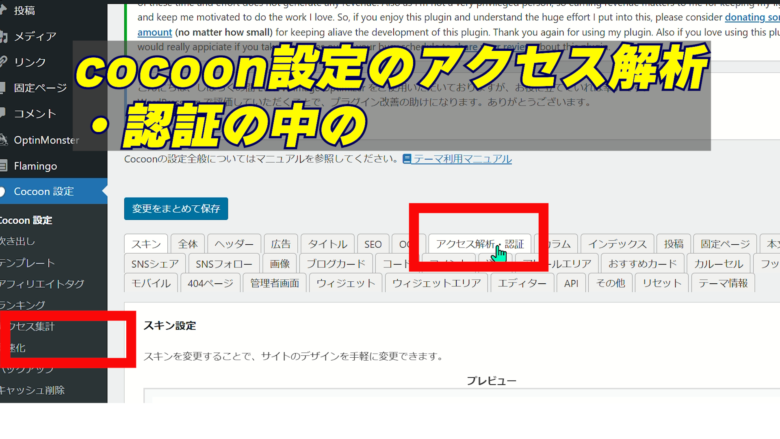 2、1.のコードをコピーしてcocoon設定の「アクセス解析・認証」を開き