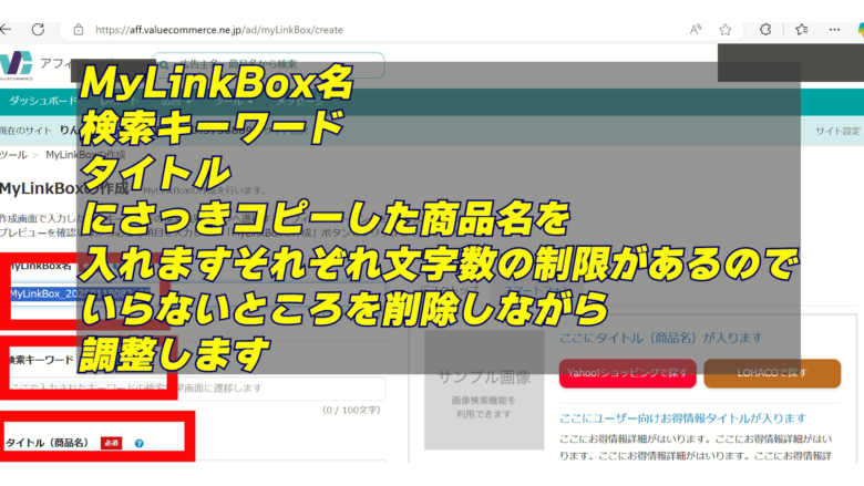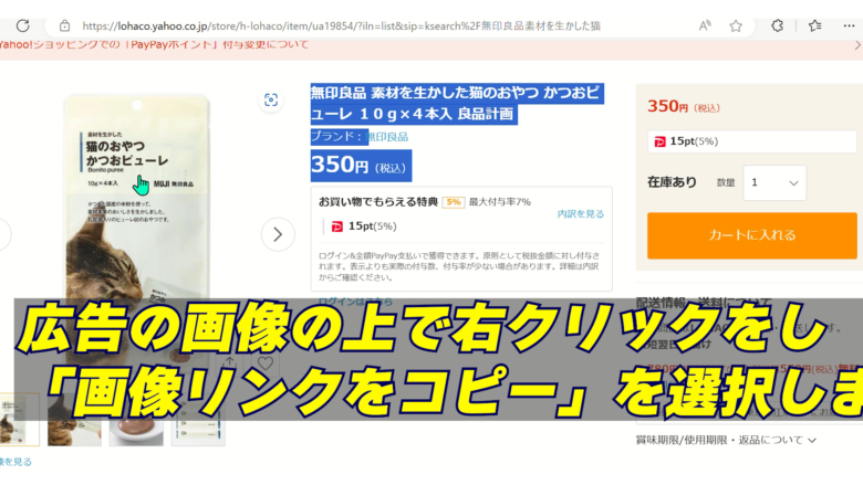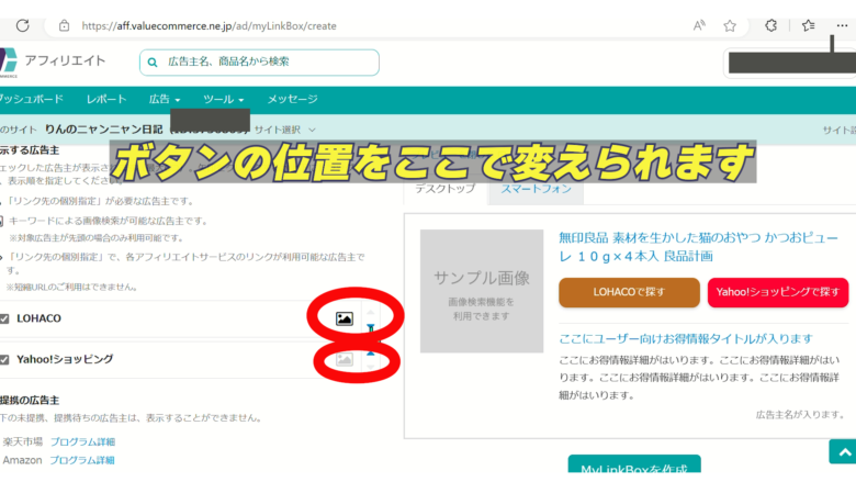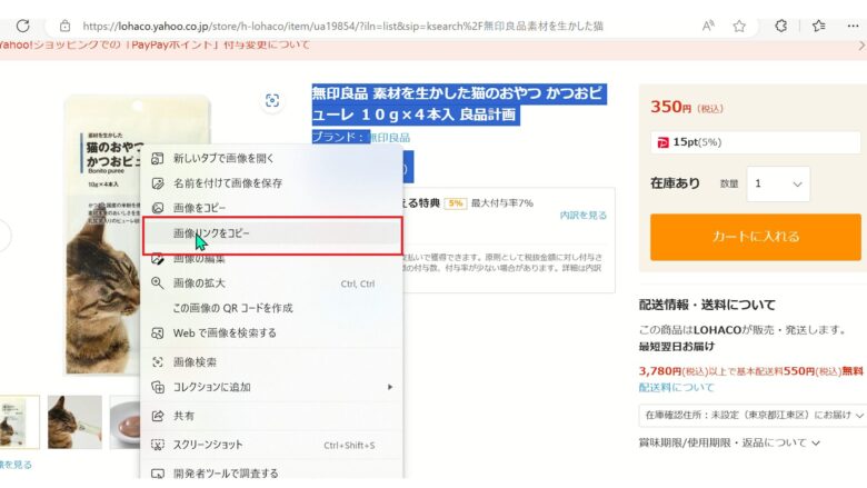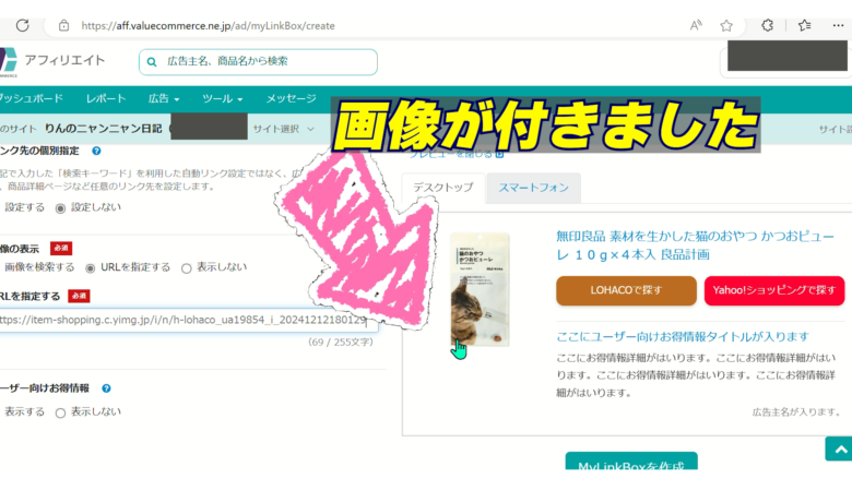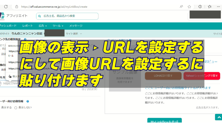 7、画像を付ける場合は、LOHACO画面で画像リンクをコピーし、MyLinkBoxの「画像の表示 → URLを設定」に貼り付け