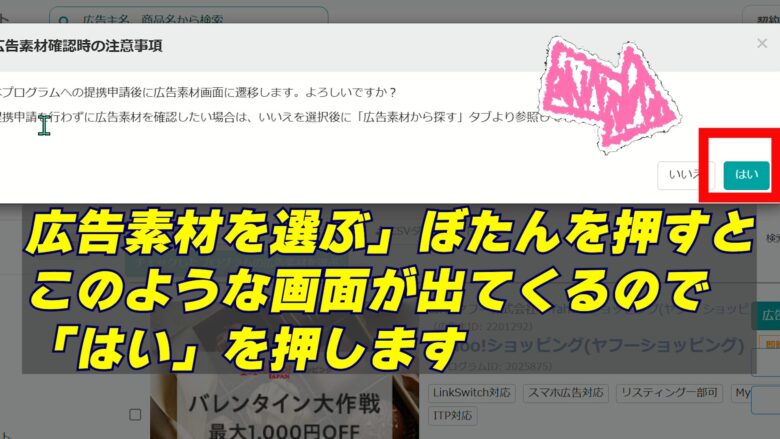 3、「広告素材を選ぶ」を選択すると確認画面が出るので「はい」をクリック