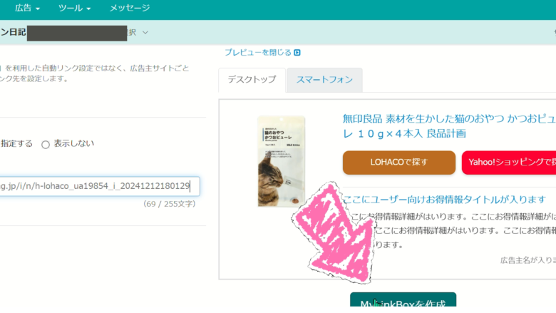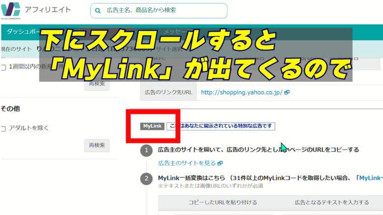 右側に広告素材が出てくるのでしたにスクロールして「MyLinkまでいきます
