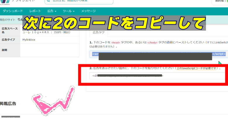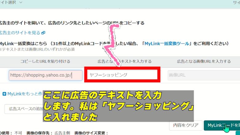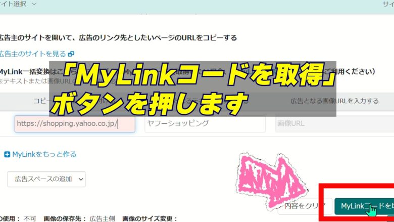 6、広告サンプルの下にある「MyLinkコードの取得」を押し、URLとテキストを入力