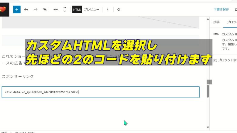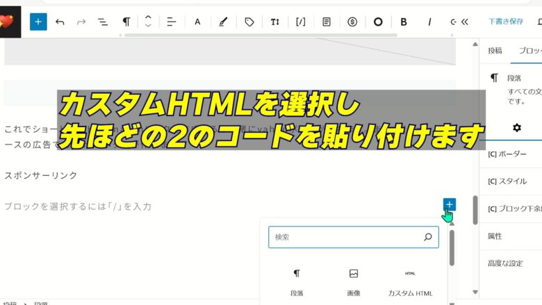 5、広告を付けたいブログの投稿画面に行き広告は貼り付けたい場所に「カスタムHTML」で貼り付けます