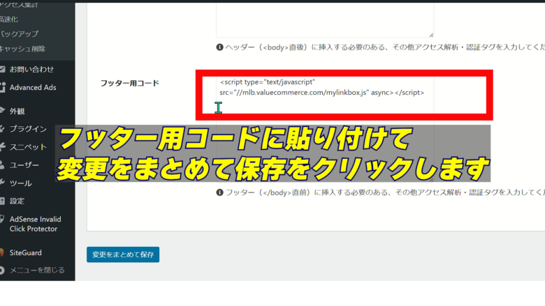 3、ヘッダー用コードでも良いのですがそこには他のコードがいろいろ入れてあるので私は今回は下のフッター用コードに貼り付けてました。下の変更をまとめて保存をクリックします。