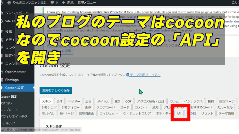 1、WordPress管理画面 → 「Cocoon設定」 → 「API」タブを開く(私のテーマはcocoonなのでcocoonの場合のやり方になりますが他のテーマでも同じような感じだと思います)