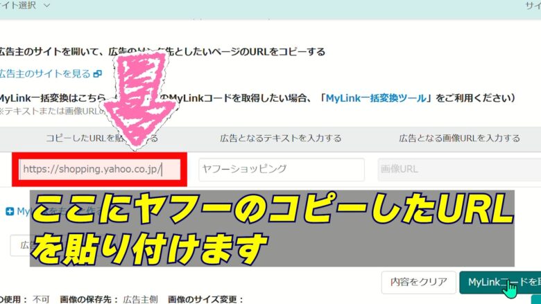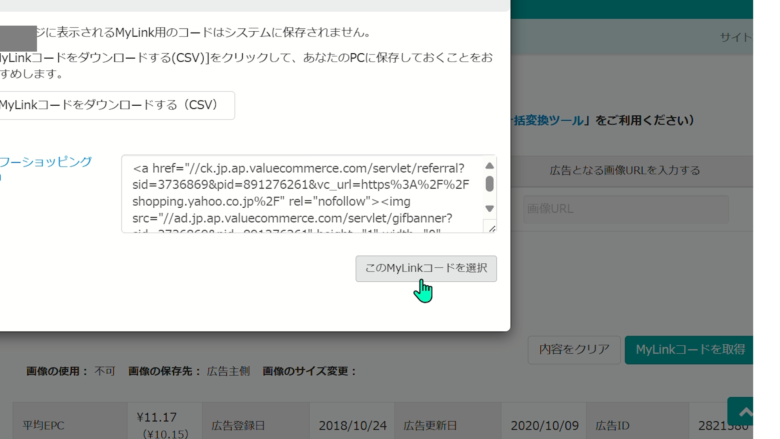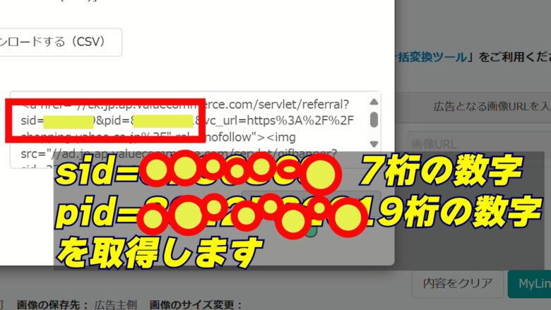 7、URL:https://shopping.yahoo.co.jp/ テキスト:ヤフーショッピング MyLinkコードダイアログが表示されるので、コードの中から「sid」と「pid」を取得してください。
