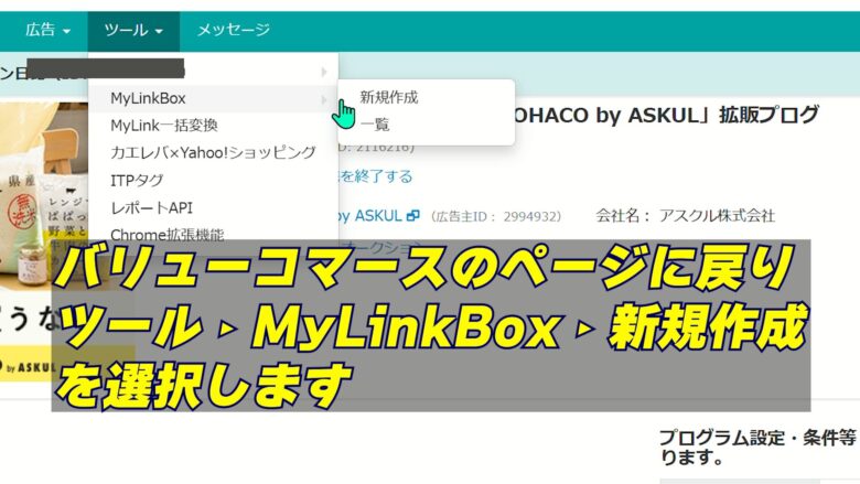 4、バリューコマースに戻り、「ツール → MyLinkBox → 新規作成」を選択