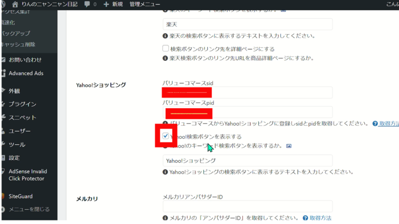 2、Yahoo!ショッピングのsid(7桁)とpid(9桁)を入力