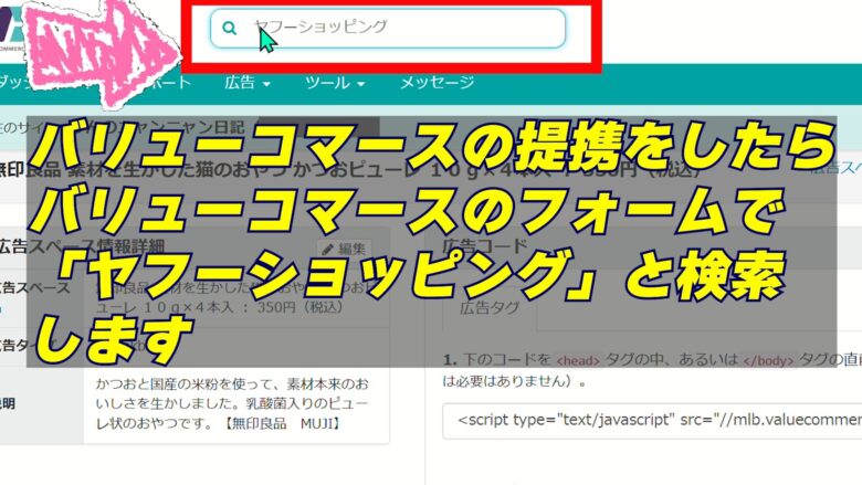 1、バリューコマースの検索フォームで「ヤフーショッピング」と検索
