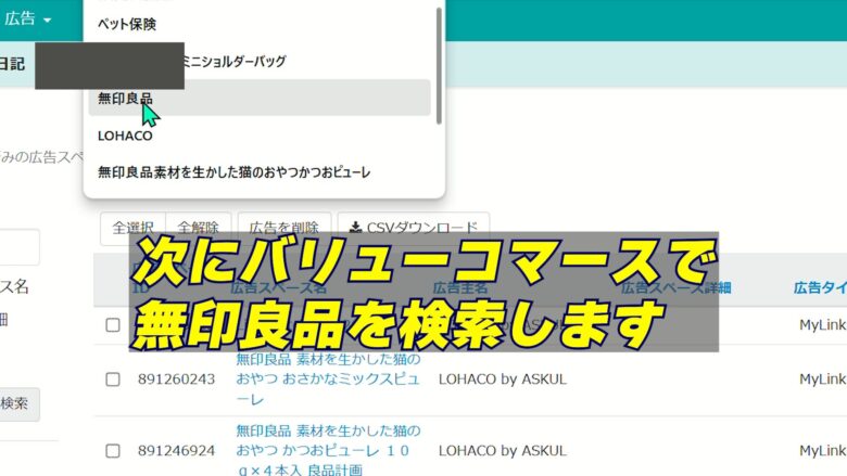 1、バリューコマースの検索フォームで「無印良品」と検索