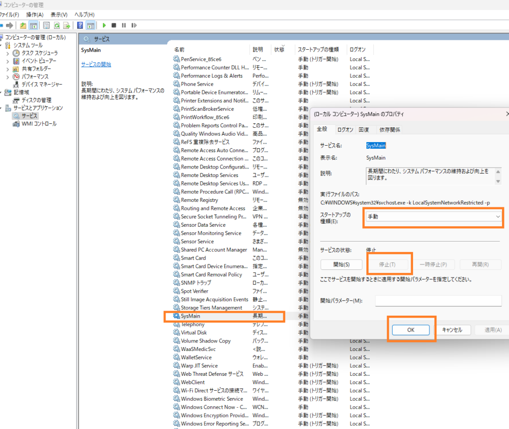 このほかにもいろいろなサイトを参考にいくつか手動にしました。中でもKP41病は停止した方がいいかもしれないサービスがありましたので停止に「SysMain」なのですが停止することでメリットもデメリットもあるようです