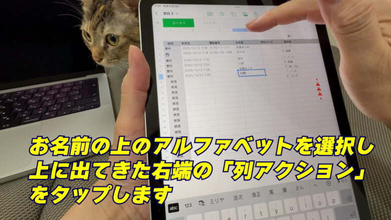 お名前の上のアルファベットを選択し上に出てきた右端の「列アクション」をタップします