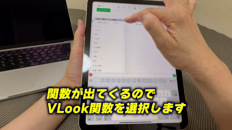関数が出てくるので「VLookup」を選びます。もし出なければカテゴリのすべてを選択するとたくさん関数が出てくるのでその中から探してください(ABC順です)