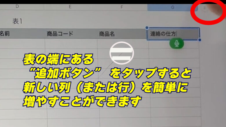 表の左端や上端にある「追加ハンドル(丸に二重線)」マークをタップします。