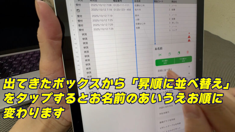 出てきたボックスから「昇順に並べ替え」をタップするとお名前のあいうえお順に変わります