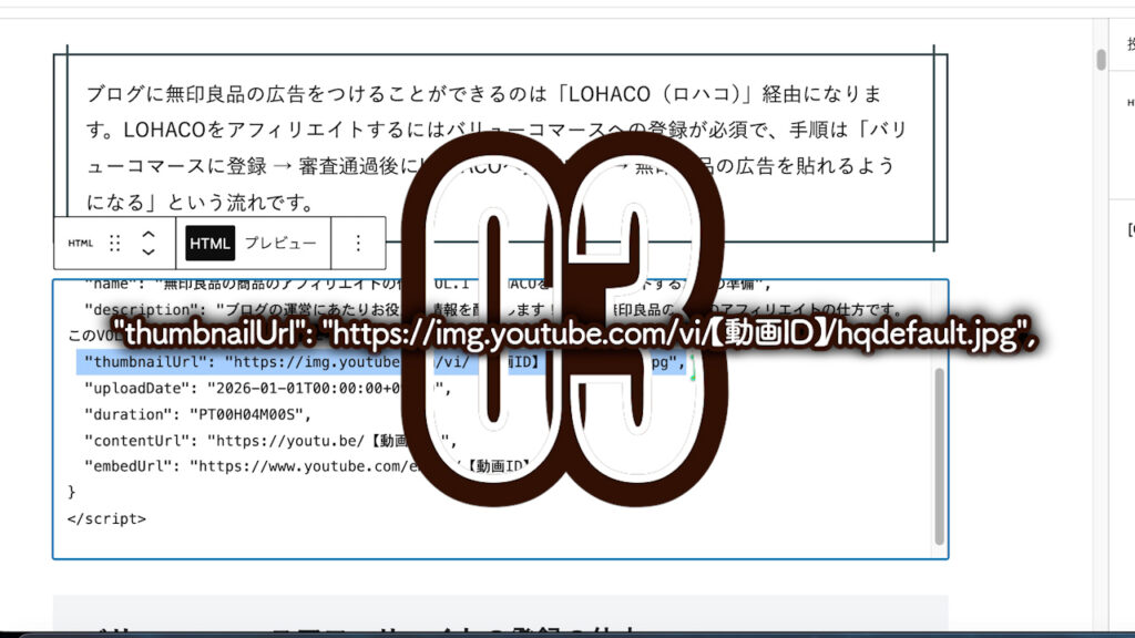 “thumbnailUrl”: “https://img.youtube.com/vi/【動画ID】/hqdefault.jpg”,サムネイルURLを入力