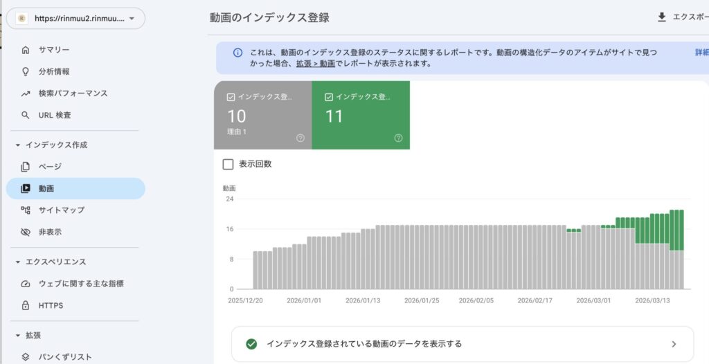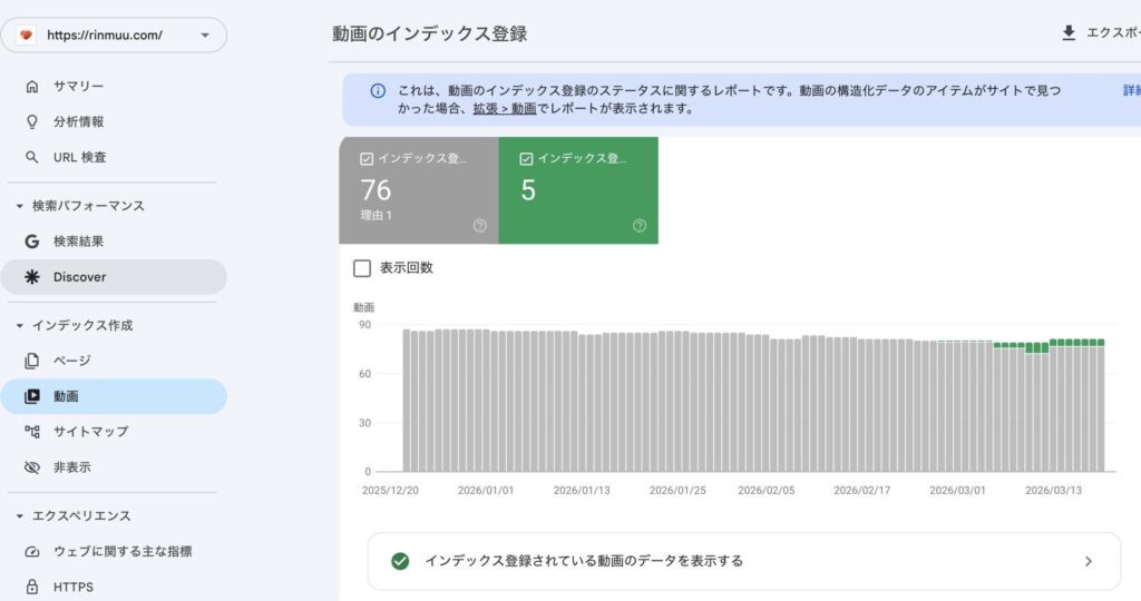 2026年3月、サーチコンソールを確認すると突然「インデックス登録済みの動画」が表示されるようになりました。しかも不思議なことに、構造化データを外した状態の記事も何件かインデックスされていました。