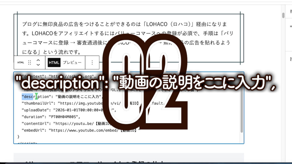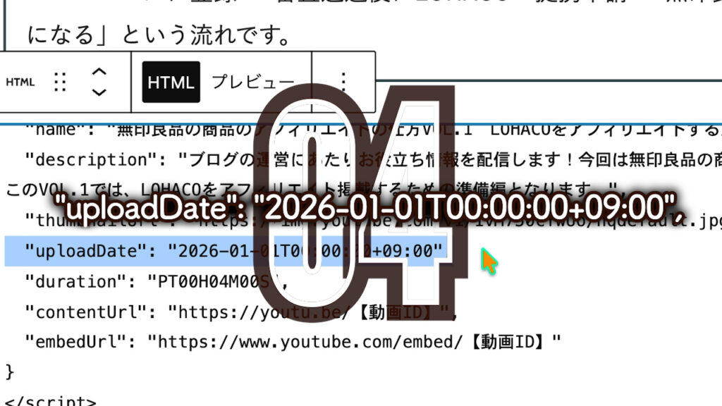 調べていると「動画の構造化データを入れるとインデックスされやすくなる」という情報を見つけました。そこでWordPressのカスタムHTMLブロックに以下のようなVideoObjectスキーマを手動で追加しました。