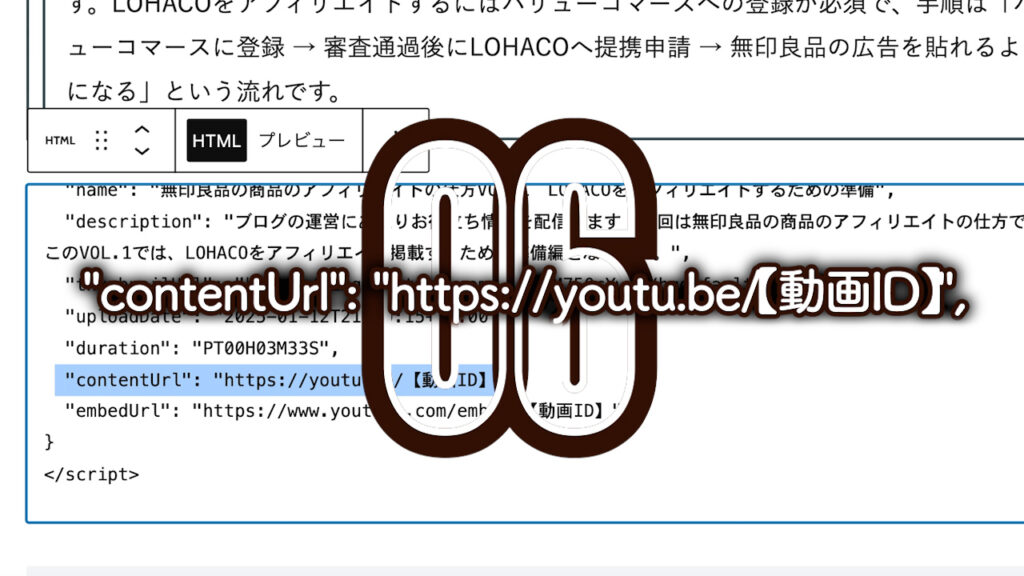 “contentUrl”: “https://youtu.be/【動画ID】”,動画URLを入力