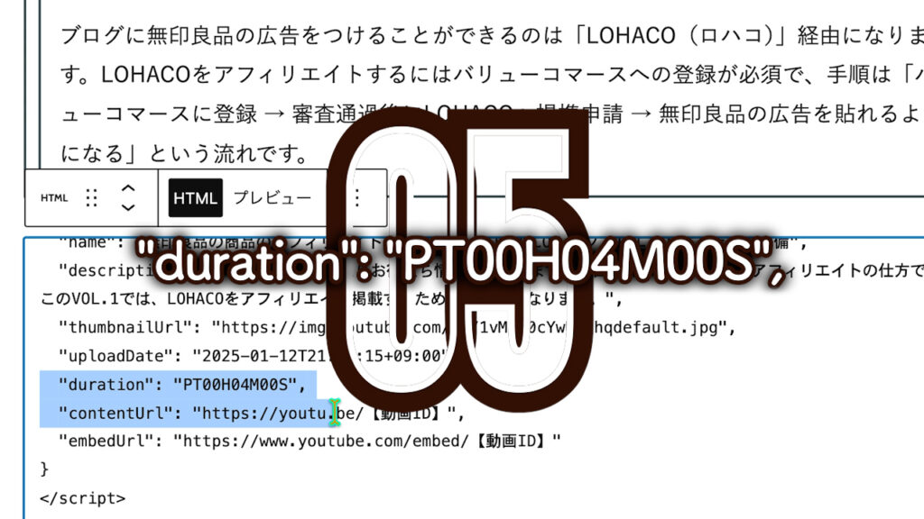 “duration”: “PT00H04M00S”,動画時間を入力