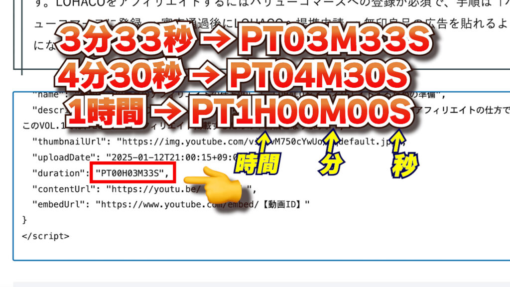 "duration": "PT00H04M00S(動画時間)",